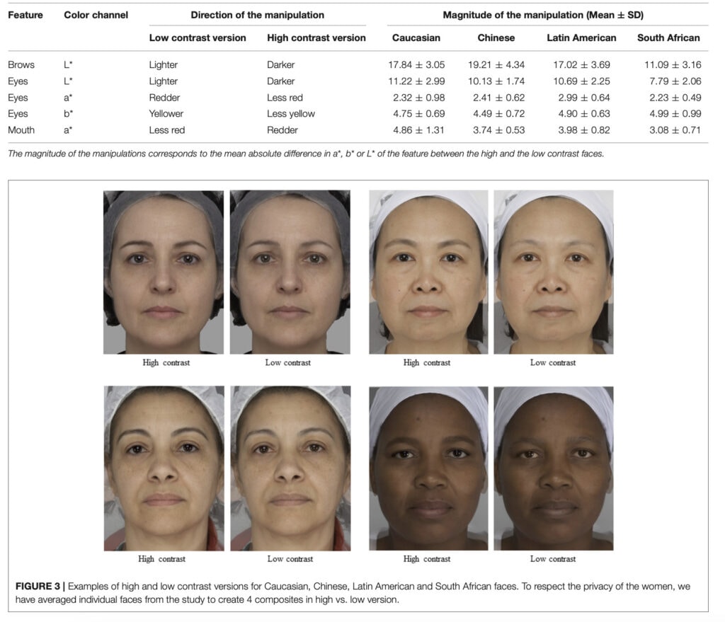 โดยใช้ระบบการวัดสีด้วย CIE L*a*b system ทั้งในลักษณะ luminance contrast (ไล่ระดับความขาว เทา ดำ ของสี) และ colour contrast (ไล่เรียงกันตามการไล่สี) * พบว่า อวัยวะบนใบหน้าที่มีอิทธิพลต่อ facial contrast สูงสุดบนใบหน้าก็คือ “สีคิ้ว” แล้วถัดมาก็เป็นตากับสีปาก
