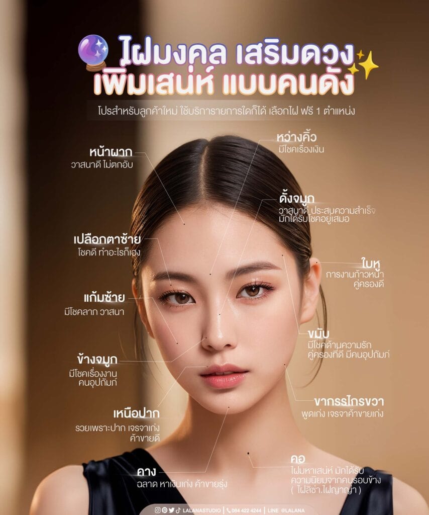 นี่เป็นตัวอย่างตำแหน่งไฝ บนใบหน้า เพื่อเพิ่มโชคลาภ เพิ่มความเฮง ความปัง แถมยังมีเสน่ห์น่ามองสุดๆ อีกด้วยค่ะ 🔮 ตอนนี้ร้านเรามีโปรสำหรับลูกค้าที่เข้ามาใช้บริการใหม่ ไม่ว่าจะเป็นบริการอะไรก็ได้ แถมฟรีสักไฝ มงคล 1 ตำแหน่ง สอบถามรรายละเอียดเพิ่มเติม Click